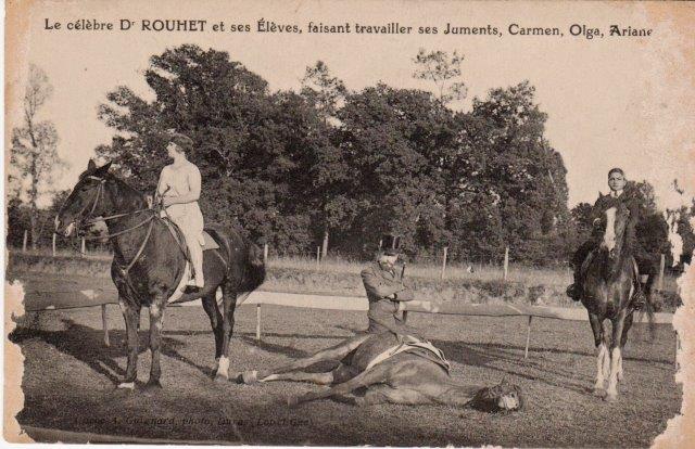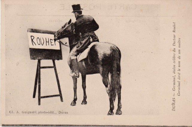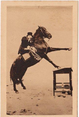 Described by Jean-Yves Marniesse, a Monségur local historian, as the “Don Quixote of the Dropt”, Georges Rouhet was a man of many talents. His legacy is two-fold. Firstly as what we would probably call today as a naturopath with a great belief in physical exercise as a stimulant to good health – he was a fond of taking mid-winter dips in an icy Dropt. Secondly he was a talented horse trainer, as the postcards bear witness to. Not much is known about this latter skill and we have to date only the cards to show us.