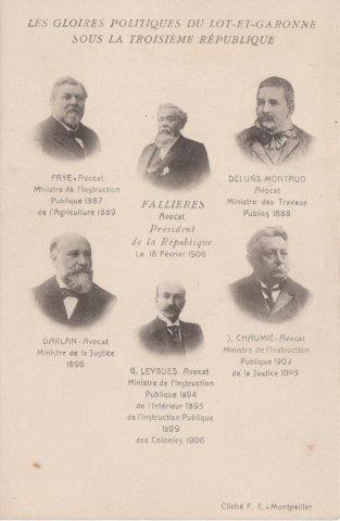 The end of the nineteenth century and the beginning of the twentieth saw a number of politicians from the Lot-et-Garonne make their mark at a national level, including one president. Clément Armand Fallières was president between 1906 and 1913. Fallières was almost a local lad being born in Mézin in Lot-et-Garonne. In addition there were five other Lot-et-Garonne politicians who became nationally well known, Pierre-Deluns Montaud born in Allemans-du-Dropt, Étienne Léopold Faye born in Marmande, Georges Leygues born in Villeneuve-sur-Lot, Joseph Chaumié born in Agen and Jean-Baptiste Darlan born in Podensac (Gironde).