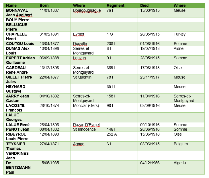 The war memorial is right in the heart of the village and is of a traditional obelisk design. In total there are nineteen names commemorated, seventeen from World War I, one from World War II and one from the Algerian war. To our knowledge there are no residents of Serres- et-Montguyard today having the same surnames.